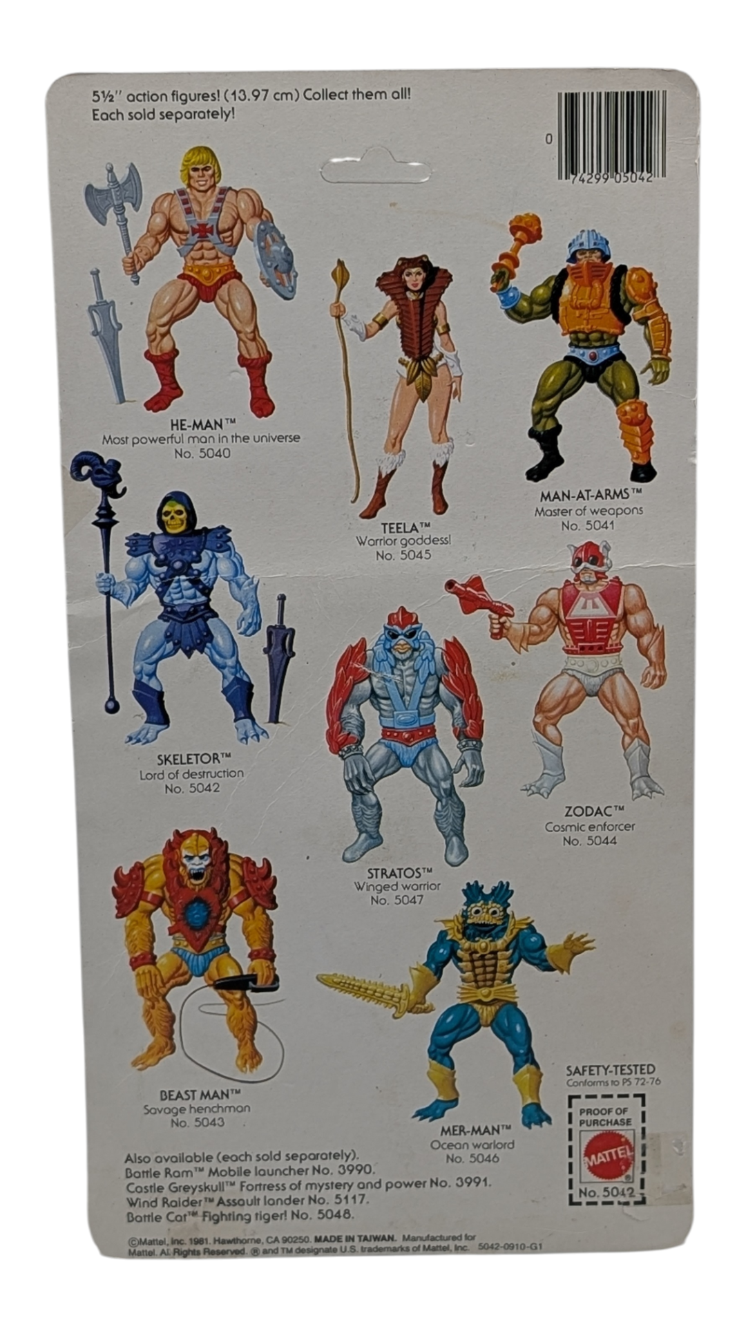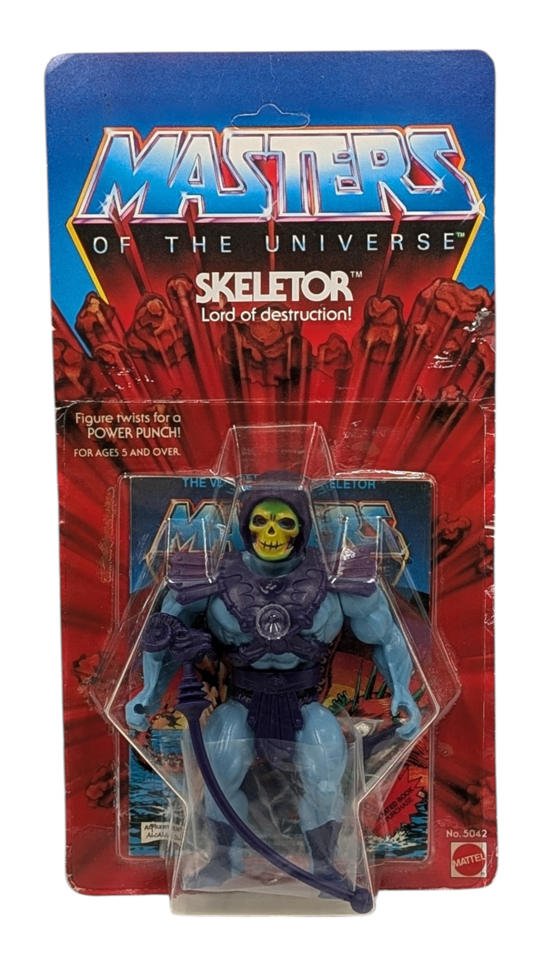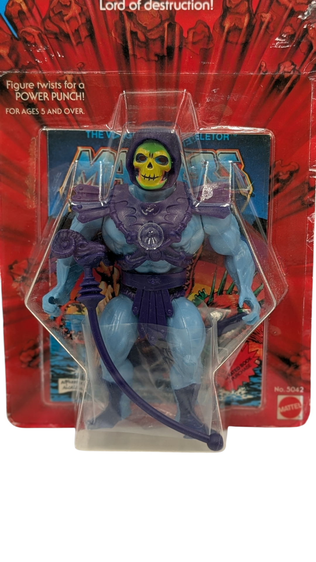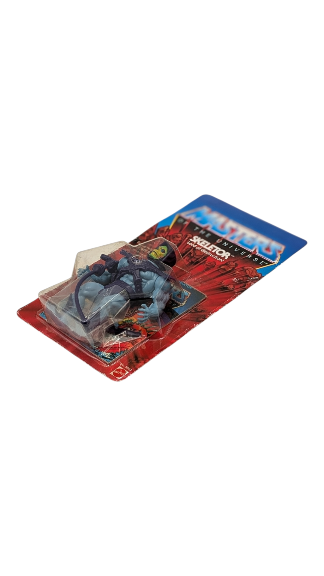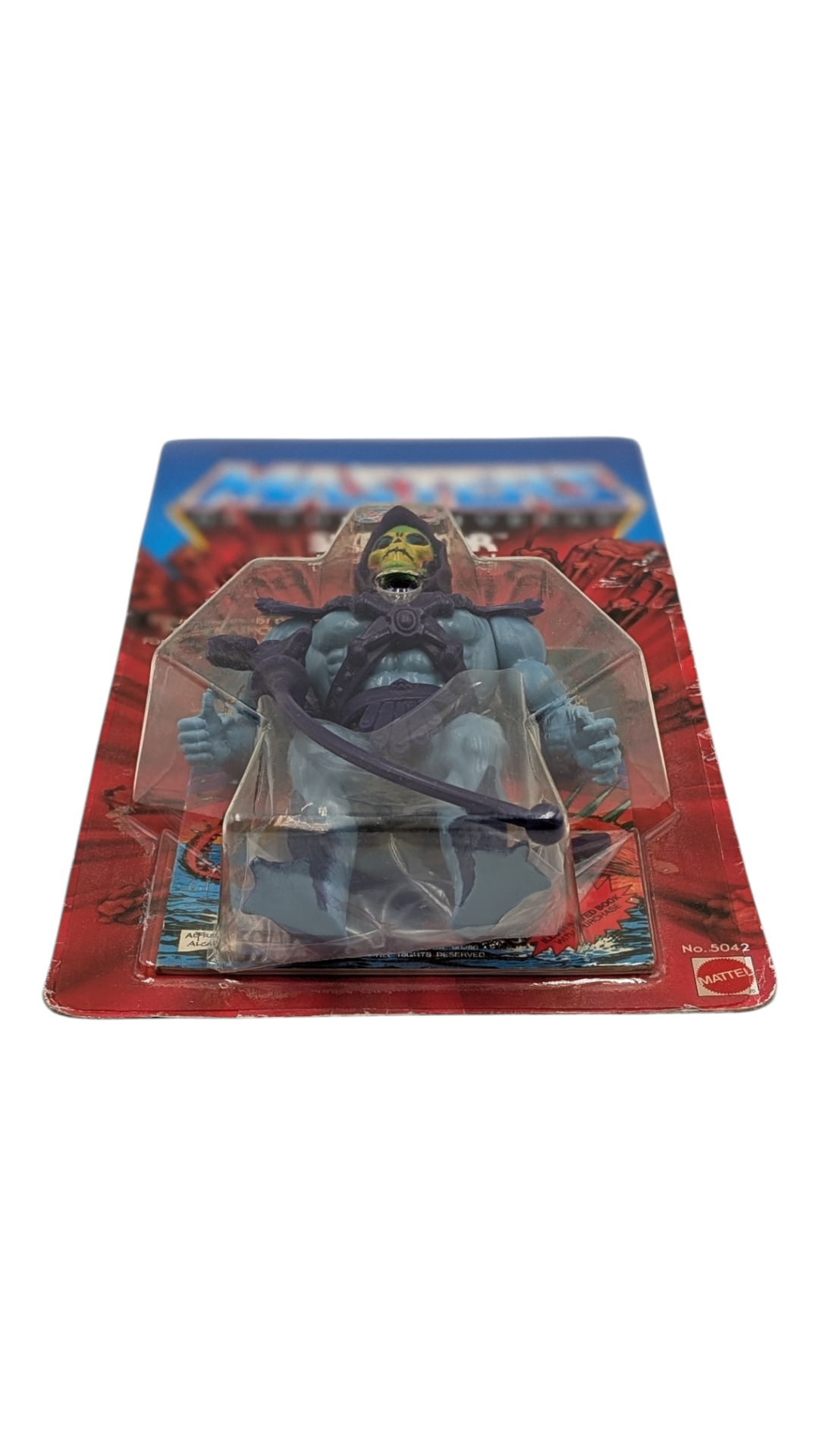 echter Sammlerschatz: Einen US „Testmarket“ Skeletor MOSC auf einer originalen 8 Back-Karte in schönem Sammlerzustand ohne jegliche Beschädigungen am Blister. Die Bezeichnung „8 Back“ bezieht sich auf die ersten Rückseiten (Cardbacks), die 1982 mit der allerersten Wave von acht Figuren veröffentlicht wurden. Abgebildet sind dort die ersten acht Charaktere der Masters of the Universe-Reihe. Insgesamt existieren drei verschiedene 8 Back-Varianten: 1) Ohne Figuren-Nummern, 2) Mit Figuren-Nummern, 3) Mit Figuren-Nummern und Garantiehinweis. Bei diesem Exemplar handelt es sich um die seltene Variante mit Figuren-Nummern, jedoch ohne Garantiehinweis – eine echte Rarität. Der enthaltene Skeletor ist eine Testmarket-Figur der allerersten Auflage, erkennbar an seinen charakteristischen pfirsichfarbenen Wangen, den halb bemalten Stiefeln und der lilafarbenen Hose –Details, das diesen MOSC (mint on sealed card) zu etwas ganz Besonderem machen! Skeletor gilt bis heute als der wohl ikonischste und meistgefeierte Schurke des MOTU-Universums. Als ewiger Gegenspieler von He-Man führt er seinen unermüdlichen Kampf um die Herrschaft über Eternia.